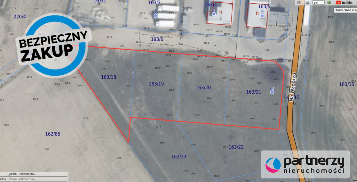 Przedmiotem sprzedaży są cztery działki o łącznej powierzchni 4099 m², sprzedawane jako całość: 163/21, 163/20, 163/19 oraz 163/18. Dojazd do nieruchomości drogą utwardzoną z kostki brukowej, bez ograniczeń tonażowych. Działki 163/21 i 163/20 są wyrównane, utwardzone oraz ogrodzone, z bramą wjazdową o szerokości 7,8 m. Na działce 163/21 znajduje się przyłącze wody i energii elektrycznej, pozostałe media dostępne są w drodze. Zgodnie z miejscowym planem zagospodarowania przestrzennego działki oznaczone są symbolem B.34-MN, MW, U - tereny zabudowy mieszkaniowej jednorodzinnej, wielorodzinnej oraz usługowej.
